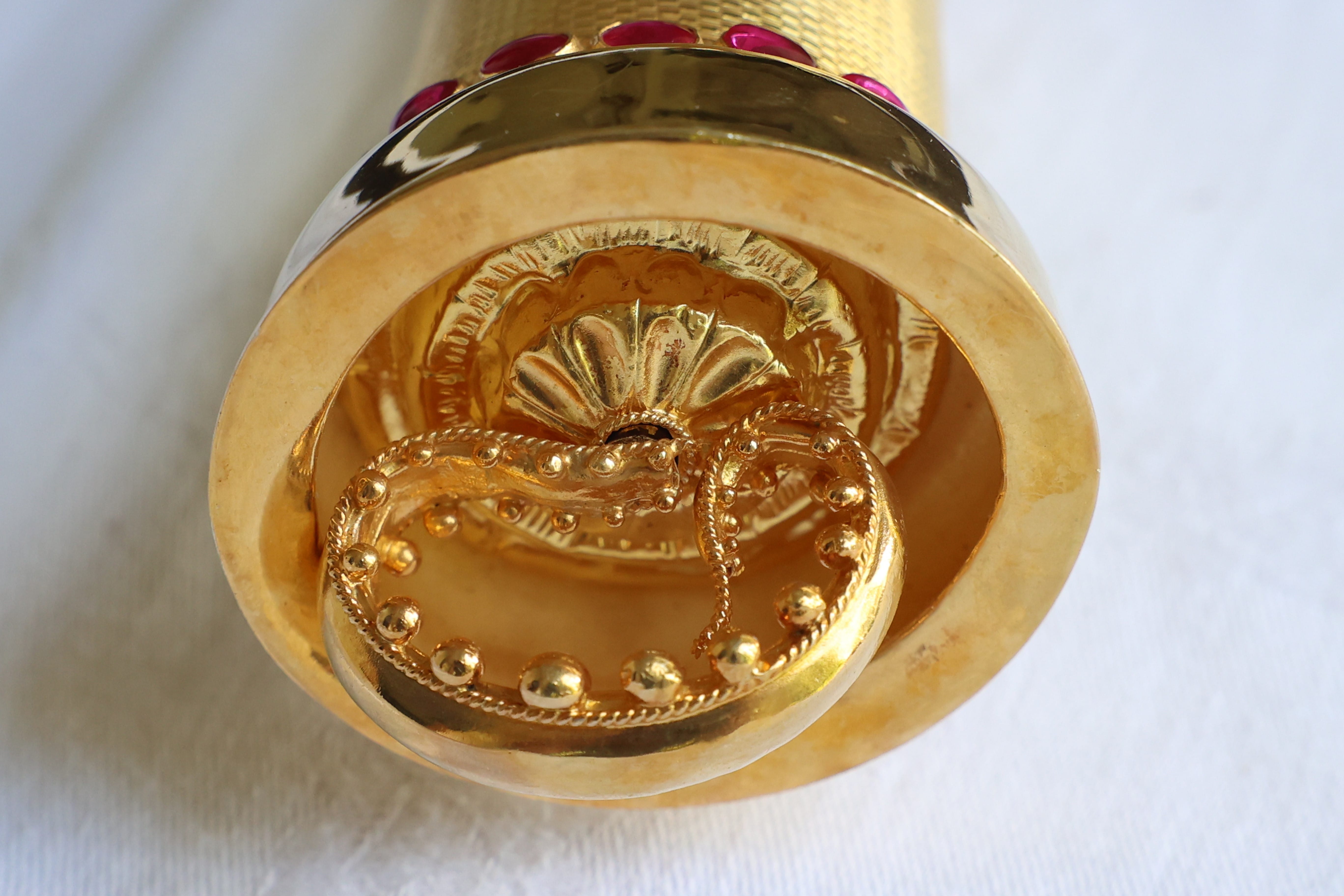 This kris, a traditional dagger symbolising power, was crafted by Balinese artisans. Its hilt and sheath are adorned with gilded silver and ruby gemstones. The blade is forged using a complex metal-layering technique that produces a distinctive pamor pattern known as Beras Wutah (“scattered rice”), which is traditionally believed to bring prosperity.