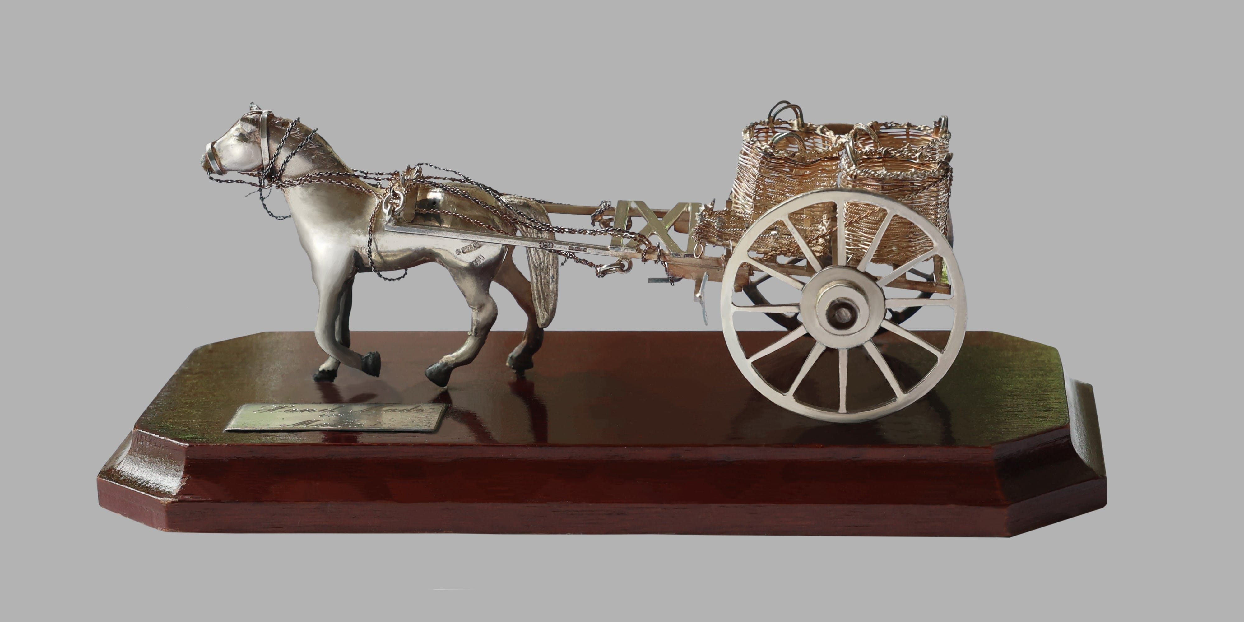 This silver gift is a stylised depiction of a horse and buggy cart with three round baskets and a silver tray, executed in delicate filigree work.