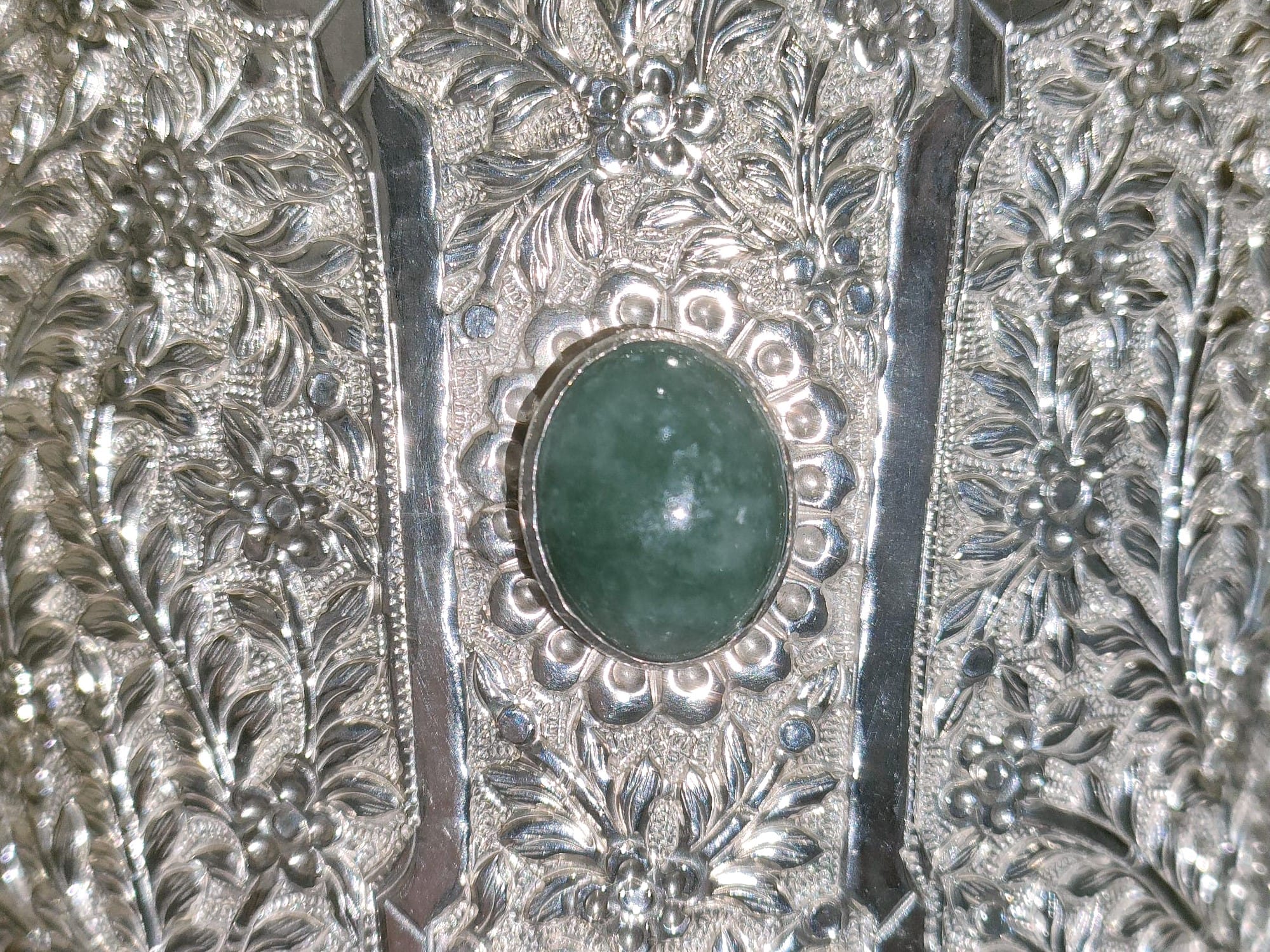 This vase was crafted from silver and embedded with green jades. Its ornate floral and foliage patterns are created using repoussé, a metalworking technique in which a flat sheet of metal is hammered from the reverse side to form raised relief. The details from the front are then refined through chasing.